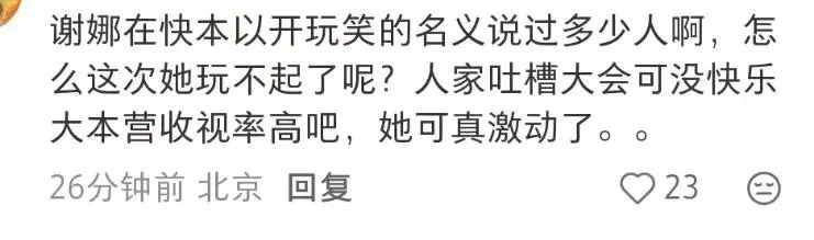 也有网友为她找补,觉得好友在这种公开场合、公开调侃,算不上什么大事——可如果这么说,粉丝就更该替薛之谦叫屈了,他也可以拿幽默的旗号给自己挽尊呢。