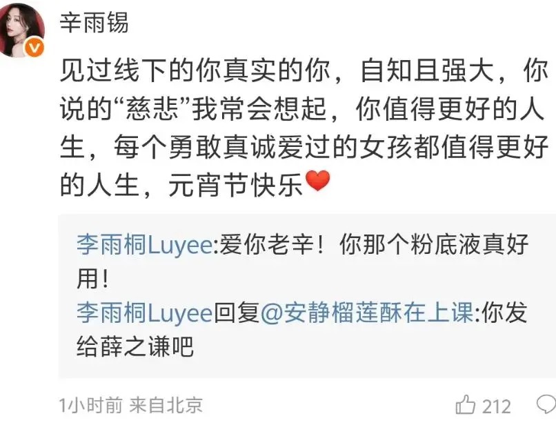 曾经锤过渣男男星的辛雨锡发评论力挺李雨桐,在她的社媒底下用了好几个词赞美她,说她很很温柔、有力量,值得更好的人。